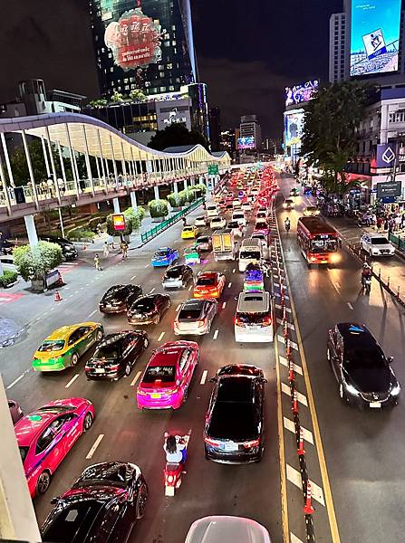 我們是回飯店後覺得部分伴手禮不錯,所以又散步來BigC買一次,夜晚的曼谷雖然是塞車,但是車子的顏色和反光感覺還蠻漂亮的。