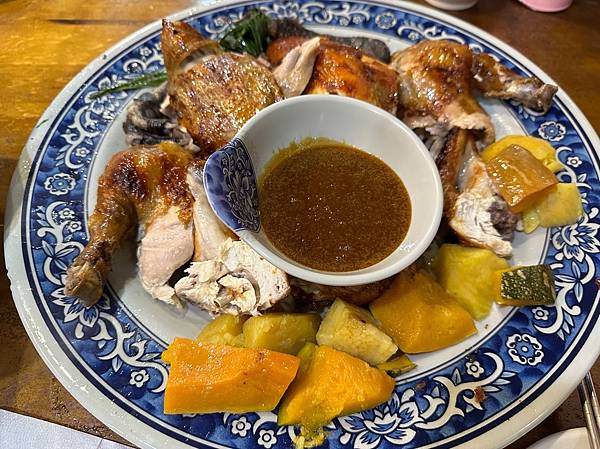 店家在上菜時已經把全雞簡單的分塊處理好了,顧客沒機會表演分雞肉的拍照紀念了。至於一起上來的南瓜、地瓜和韭菜是塞入整隻雞肚中一起烤來入菜的。