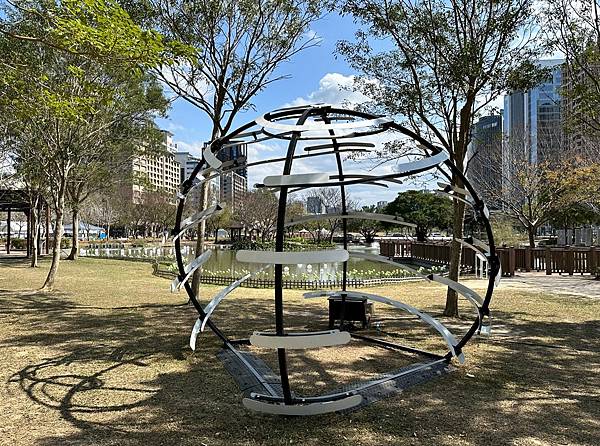 主燈夢島之境的「洄洄」為故鄉竹東的國中學妹藝術家曾令理的作品,以莫比烏斯環為設計核心,象徵水流的無窮循環,呼應生命、自然與時空的交融,展現生生不息的精神。結構融合月亮與蚺蛇的意象,透過光影變化呈現前行姿態,呼應核心的永續無限,此作品高達5.5公尺,置放於水圳前緣水面之心,方便民眾近距離觀賞。