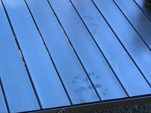 這時發現每張餐桌上都有許多的台灣獼猴巡視留下的腳印證據。