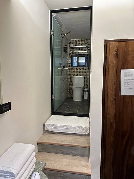 間房型比較特殊,浴室廁所要上取3-4個階梯,感覺是在一個小小閣樓裡。而且空間很小,淋浴的空間與馬桶是在一起,一次只能容納一人。