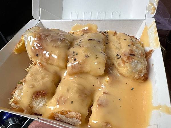 第一種是超罪惡的熔岩起司薯餅蛋餅*3份,這是店家及網路推薦的,絕對是起司控的最愛,蛋餅是酥脆的外皮,內餡的薯餅是酥軟的口感,加上滿滿的起司流淌在蛋餅上,光是看都感覺幸福滿滿,好吃是當然的。