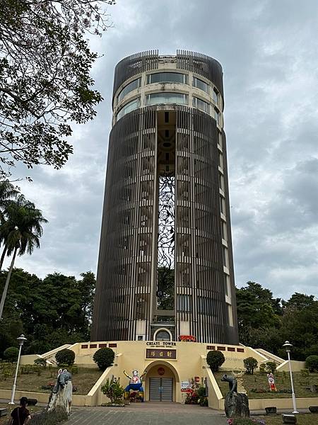 終於看到【射日塔】了,這是最具代表性的嘉義市新地標,在嘉義公園內,民眾只要仰頭看,便能看見一朵巨型豔紫荊花,與藍天相輝映,豔紫荊花為嘉義市巿花,就這樣的透過射日塔照射開來,充分顯示嘉義市花之美。