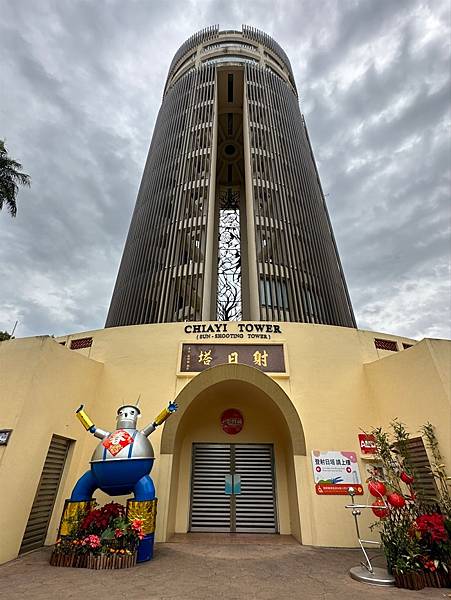 射日塔 (Chiayi Tower)高62公尺的塔式建築,共12層,塔的基座為改建後的忠烈祠,塔的入口處有一對臺灣雲豹的銅雕,由雕塑家鍾邦迪先生的創作,象徵臺灣守護神,二樓以上為射日塔主結構,大廳地版上有原住民祖靈百步蛇的馬賽克鑲嵌畫,三至九樓為為「一線天」主結構,第十、十一樓為三百六十度的眺望廳(可由二樓的電梯直達),可眺望嘉義市、阿里山、玉山……諸羅山河美景可盡收眼底。