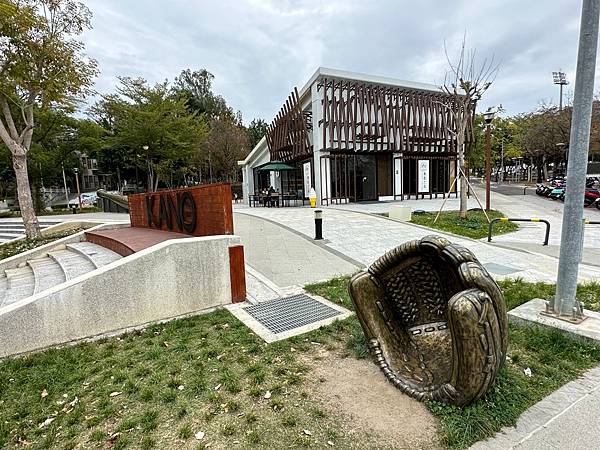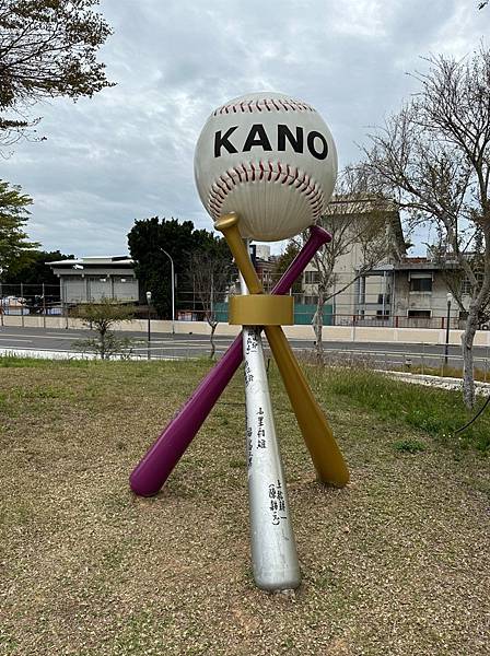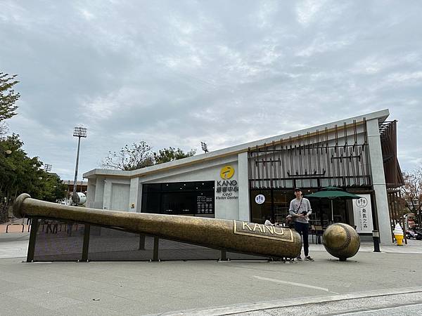 KANO遊客中心,外面有一些超大的球棒、手套和棒球。