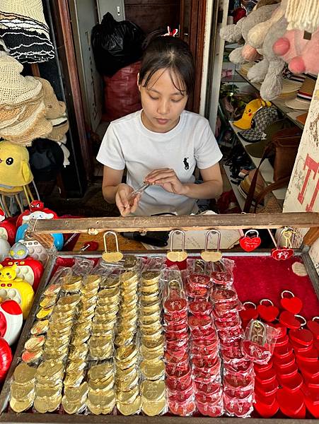 這邊直接就有攤位賣愛心鎖,價格由左至右由貴至便宜,還附贈刻名字喔。
