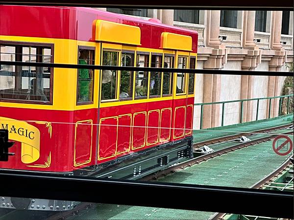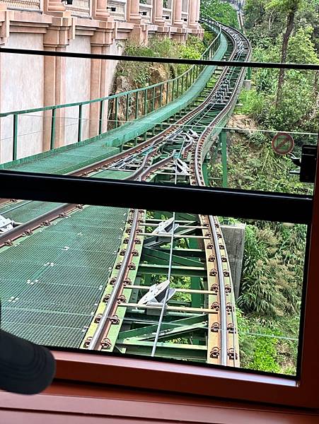 發現窗外下方的軌道,原來這是<山地列車 or 地面索道纜車(Funicular Rides)>,它的作用是快速地將遊客從月球城堡與法國村往來接送。
