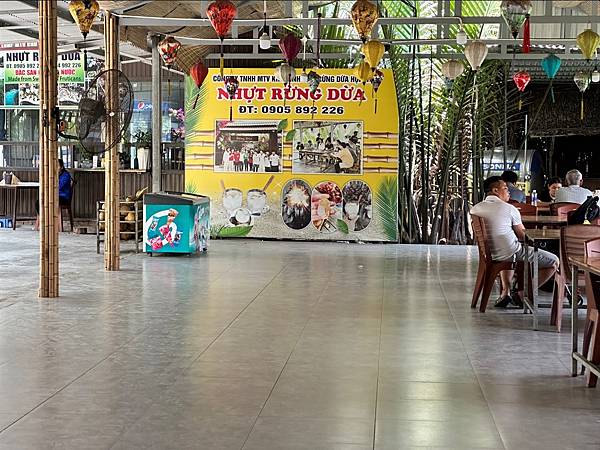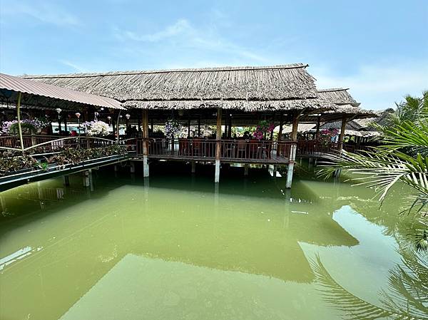 這裡不只是乘坐竹桶船的地方,還有用餐的服務喔,水上餐廳的設計。