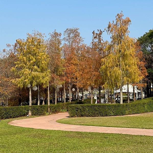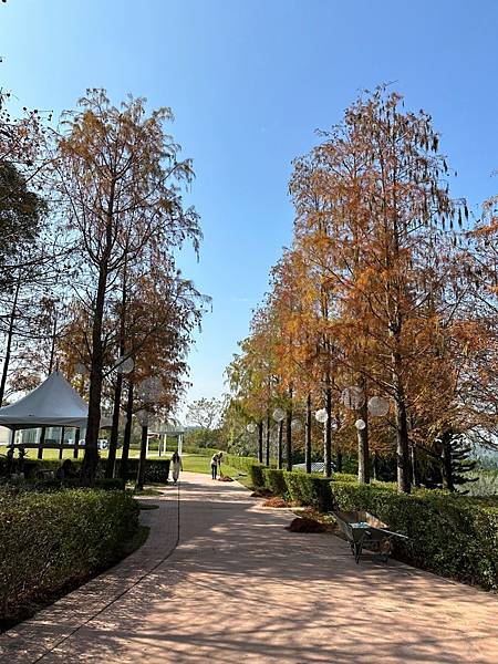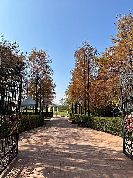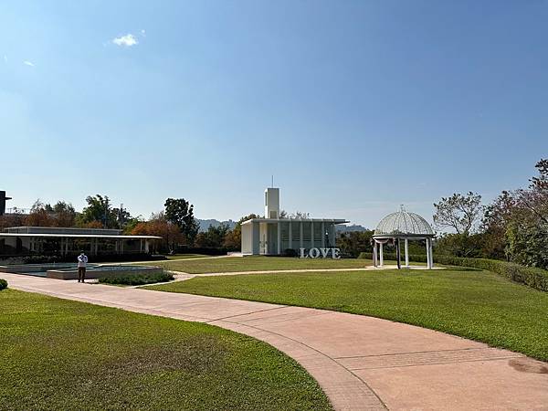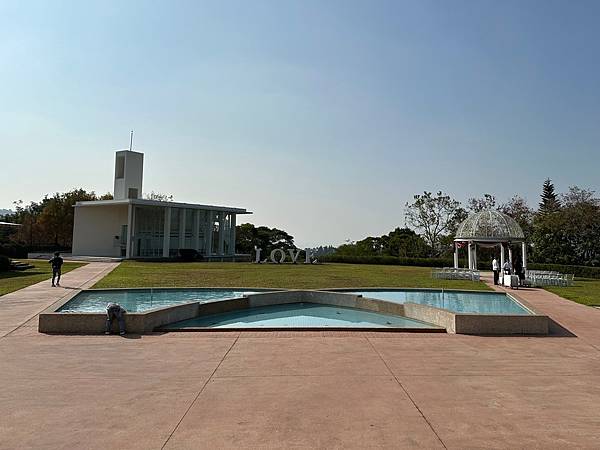 穿過落雨松可以看到一大片綠地,遠處有一個大大的LOVE,後面的那棟建築是教堂,也是舉辦婚禮用的。