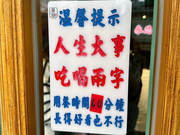 門口的這個提示好玩,用餐限時60分鐘,長得好看也不行延長時間喔。