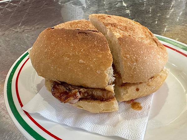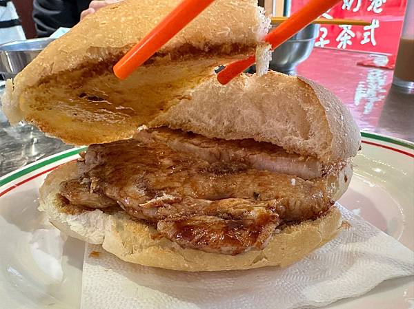 豬扒包(142元),店家選用台灣豬肉應該是里肌肉吧,嫩煎過後外酥內軟的口感,加上麵包吃起來非常有飽足感,再搭配一份奶茶就是完美的一餐了 。