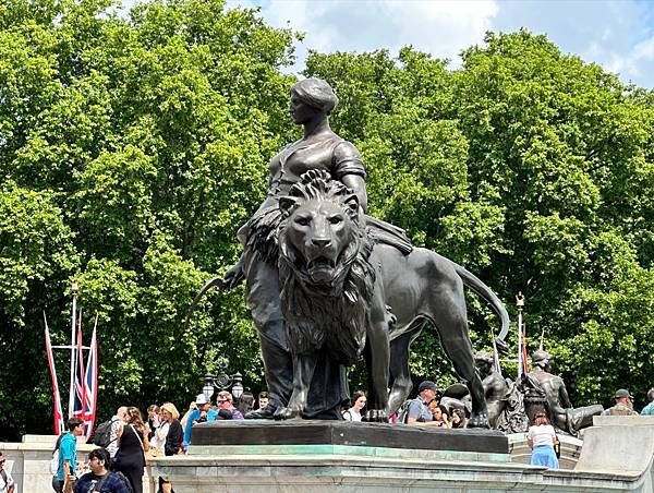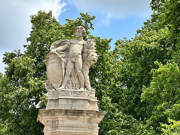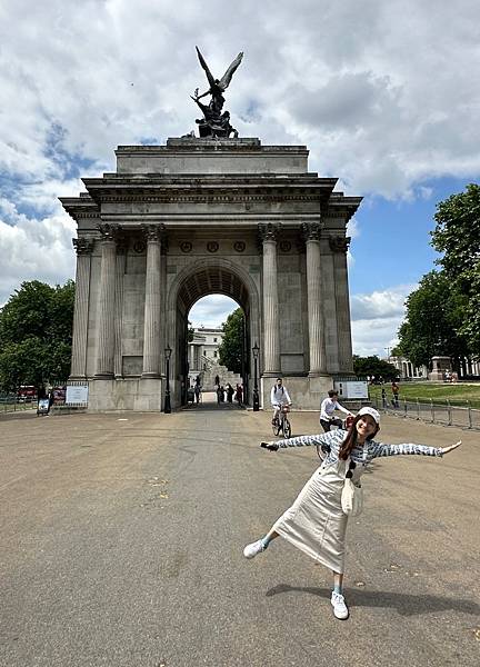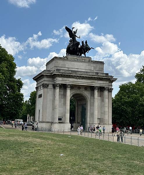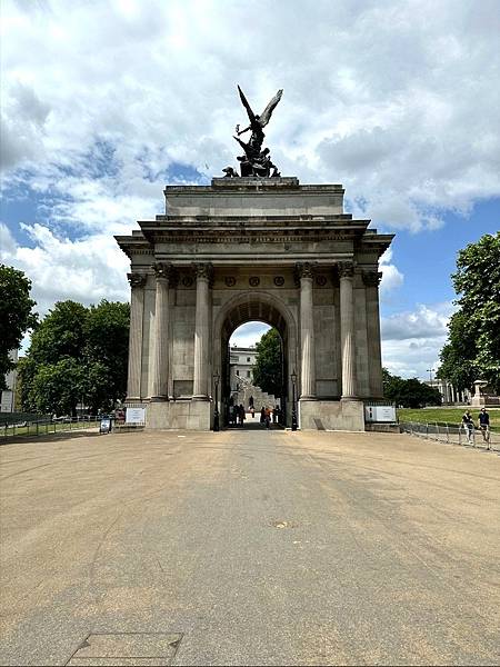 下面這個是海德公園 (Hyde Park) 東南角的威靈頓拱門 (Wellington Arch)。威靈頓拱門是倫敦最著名的地標之一,最初建於 1826 年至 1830 年,是為了紀念威靈頓公爵 (Duke of Wellington) 在拿破崙戰爭中的勝利。這座拱門的頂部有一個非常引人注目的雕塑,名為**《和平四馬戰車》(Peace and the Quadriga)**。它描繪了和平女神駕著四匹戰馬的戰車,象徵著和平與繁榮。這是歐洲最大的青銅雕塑。