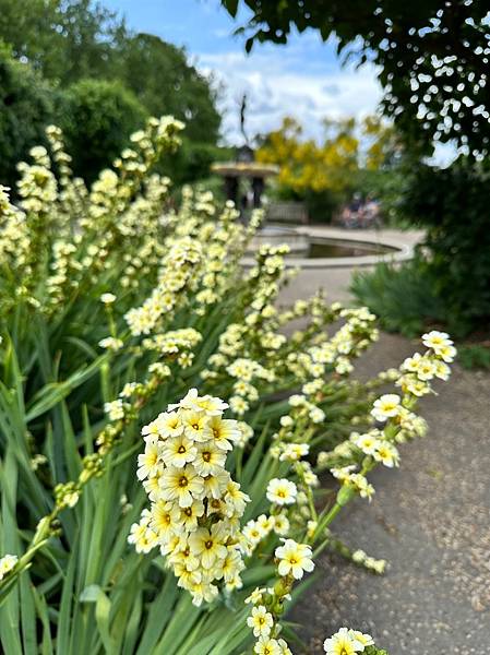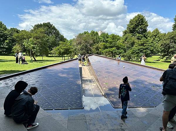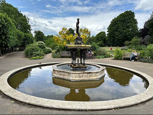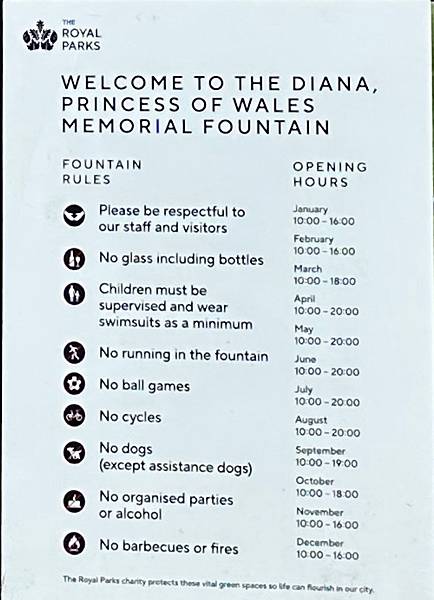 這圍起來的一片綠地是「戴安娜王妃紀念噴泉」(The Diana, Princess of Wales Memorial Fountain),這是為了紀念戴安娜王妃而設計的。它於 2004 年揭幕,設計理念旨在反映戴安娜王妃的開放和包容。