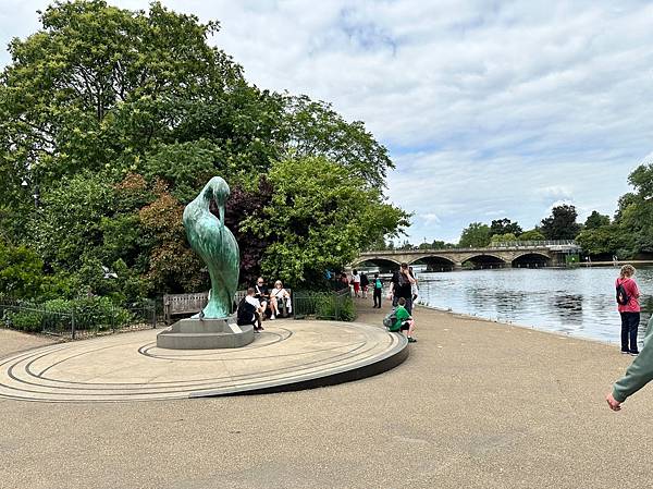 這個雕像名為「隼鳥 (The Falcon)」,是由雕塑家 George John Vulliamy 於 1964 年創作,雕像背景中的橋是蛇形橋 (Serpentine Bridge),它橫跨蛇形湖,將海德公園和肯辛頓花園連接起來。