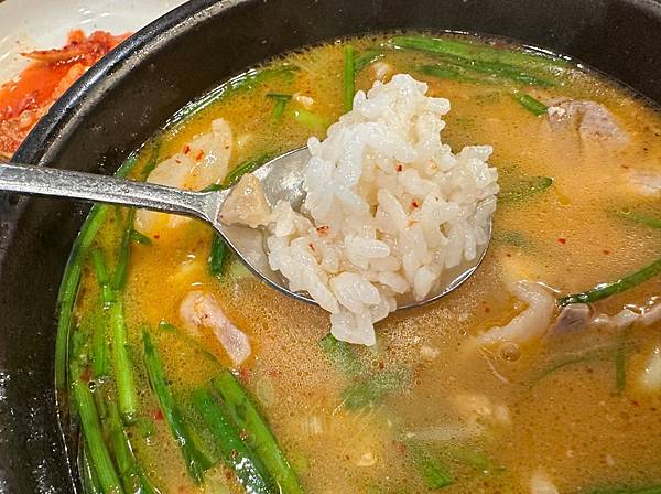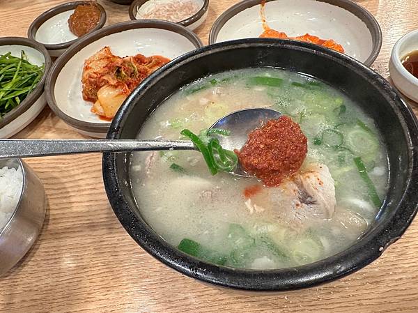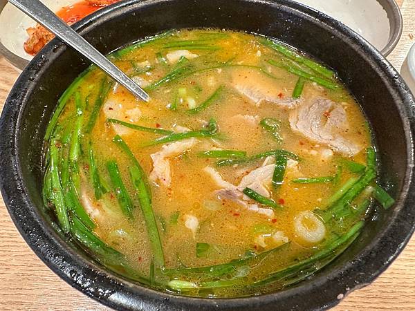 豬肉湯飯是釜山的在地特色美食,松亭三代的湯頭據稱是用豬骨熬煮多時的乳白色濃湯,口感濃郁且香醇,湯頭直接喝是清淡的,可以根據個人喜好加入蝦醬、韭菜、泡菜或辣椒醬等配料,調整湯的鹹度和風味。